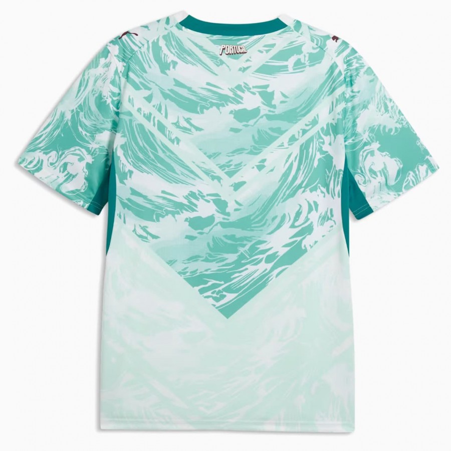 A camisa reserva masculina de Portugal da Puma para 2026 tem como tema "Heróis Conectados". A Puma acredita que os super-heróis da seleção nacional representam a comunidade futebolística global. Esses jogadores são vistos como heróis que inspiram torcedores em todo o mundo e conectam pessoas além das fronteiras. Este uniforme reserva de Portugal para a Copa do Mundo de 2026 apresenta um esquema de cores predominantemente azul-marinho, com padrões gráficos na parte superior do corpo. O corte em formato de "V" no peito e no abdômen combina diferentes tons de azul-turquesa com branco puro. A gola em "V" é branca pura, com o escudo da seleção portuguesa centralizado no peito; abaixo dele, encontra-se o logotipo da PUMA em vermelho intenso. Pelo que entendemos, o design é inspirado nos trajes de super-heróis (cortes em formato de "V") e em elementos visuais do oceano (padrões geométricos).